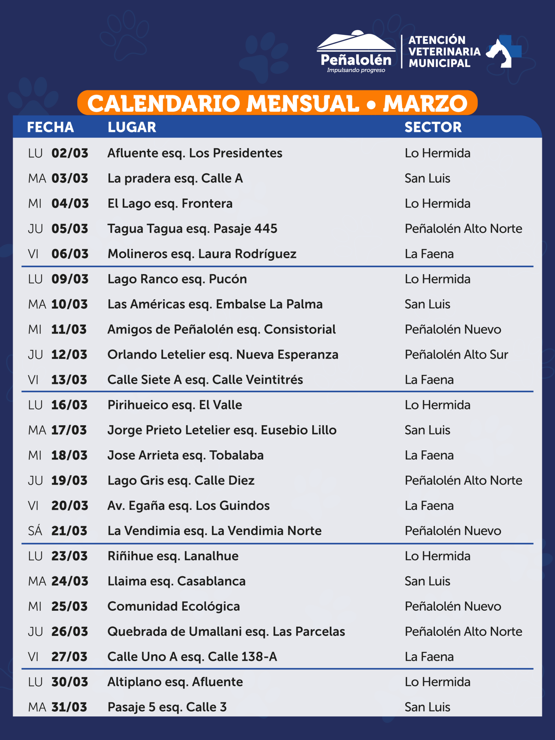 ¡Revisa el calendario del Veterinario Móvil de marzo! Organiza tu visita y acude al punto más cercano para ti. Recuerda que cuidar a tus mascotas es también una forma de prevenir enfermedades.